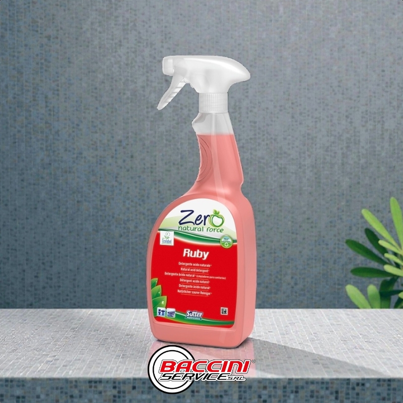 Ruby è un detergente disincrostante a base di acido organico naturale (acido citrico), ideale per l’ambiente bagno. È perfetto per la pulizia quotidiana di: